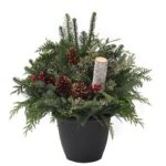 7″x9″ Noble Fir, Western Red Cedar, Oregon Juniper, white and natural lodgepole cones, Faux Holly Berries in a galvanized container.